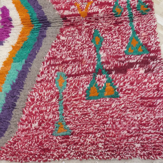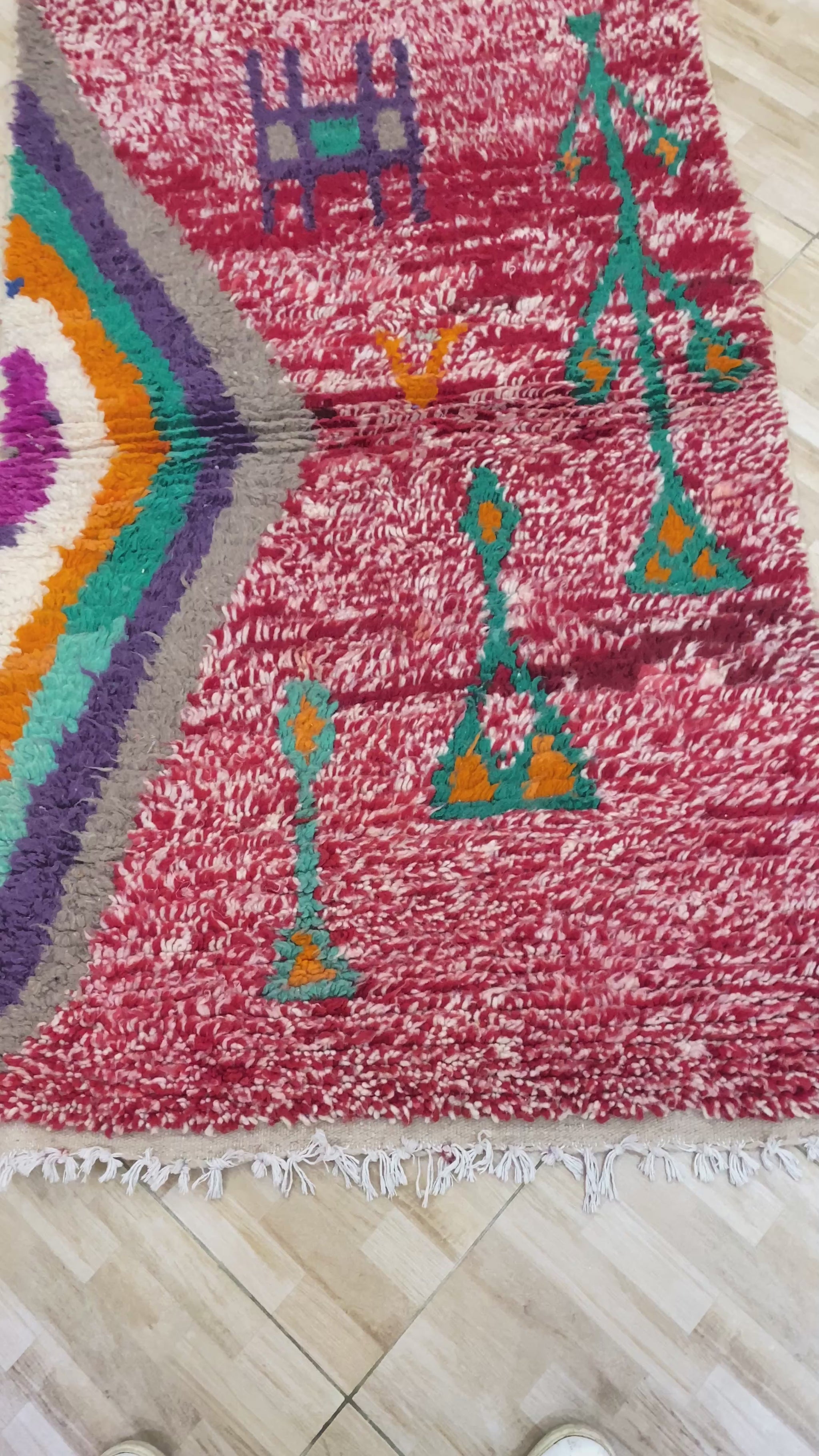 Infuse your home with the soul of Morocco through this stunning handmade Berber rug. Crafted with passion from 100% natural wool, this piece combines a vivid red background with colorful Amazigh motifs that tell stories of heritage, energy, and creativity.